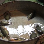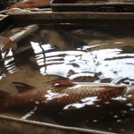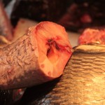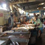 When in Kolkata, we make sure we do not miss the opportunity of going to the fish market in the mornings just to lust at those fresh fishes; smile at the greed of the other buyers; strike a conversation with the vendors to find out how early they wake up, where they go to get their stock, their stock turnover; be struck by gluttony ourselves and buy more than what we can eat; come back home and make ridiculous demands of our cook!!! And we take Ridi (our daughter) too so that she can squeal in delight upon seeing the fishes jump around in the vessels and meow with the cats eyeing the fishes…:-)
