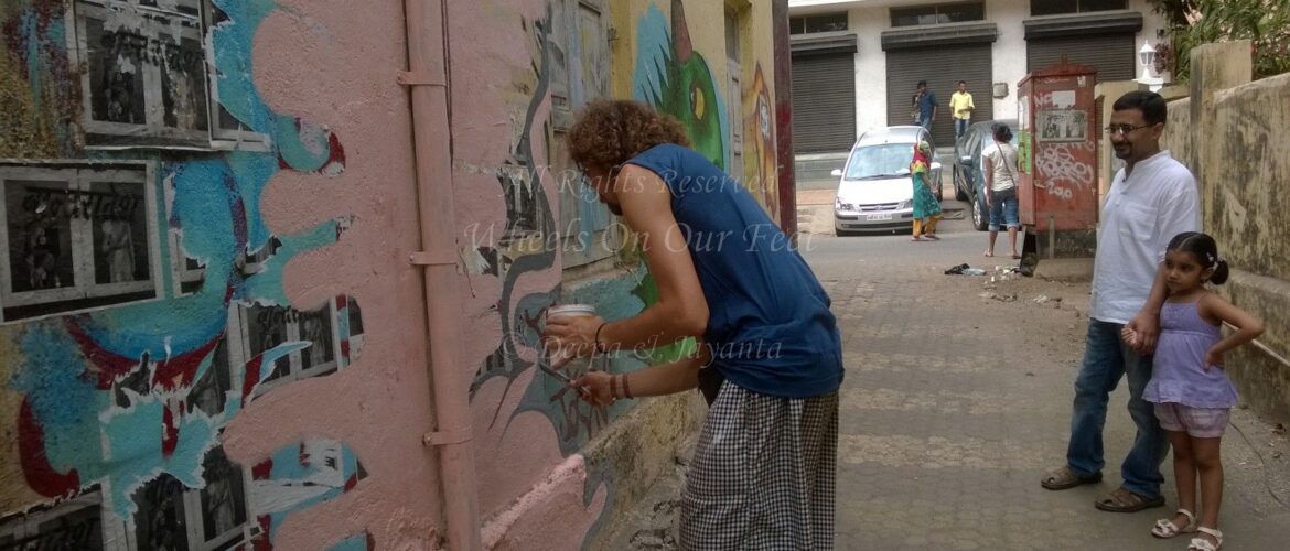 We were waiting outside Imbiss for our turn at the lunch table this particular Sunday, when I noticed a foreigner walk up to the narrow lane opposite us with this big bag, take out cans of paint, brushes, wipes and then test the walls, perhaps for smoothness. Why yes, I had seen street art in the long stretch of the Tulsi Pipe Road near Dadar. And more, recently, in Mahim too. Aha, I pointed to Ridi, my 6-year old. This man is going to paint the walls. Let’s go watch him.