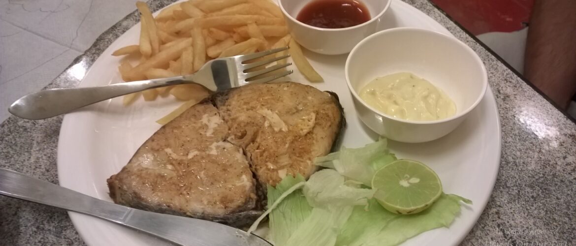Food at Farm Fresh in White Town, Pondicherry: Farm Fresh supposedly uses organic raw materials for all its dishes. We ordered a Grilled Fish and Mosambi Juice. That was it. We had absolutely no appetite. The juice was made with fresh mosambis. The Grilled Fish was for our daughter and she liked it with the Potato Chips and Tomato Ketchup.